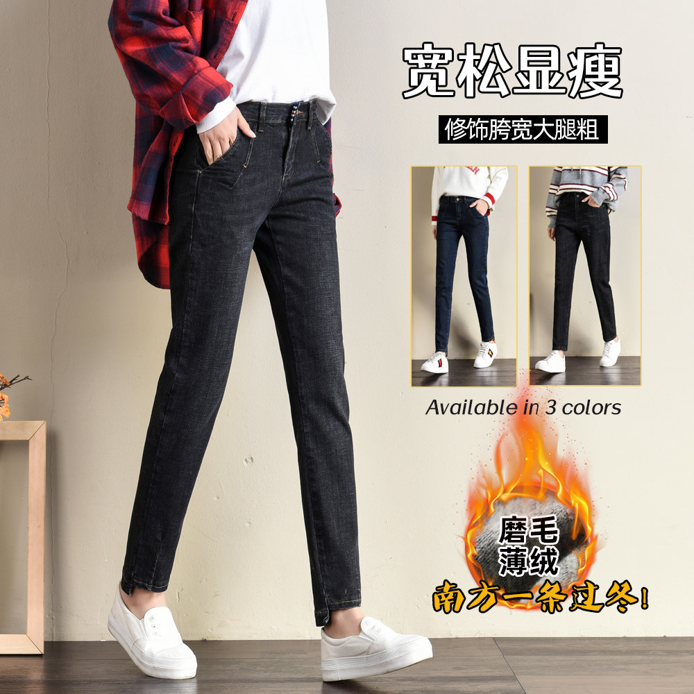 秋冬薄绒哈伦牛仔裤女小脚裤高腰显瘦磨毛加厚抓绒宽松胯宽肚子大
