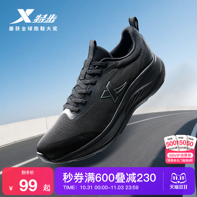 特步羽逸丨运动鞋男秋冬新款黑色皮面防泼水轻便减震网面跑步鞋子