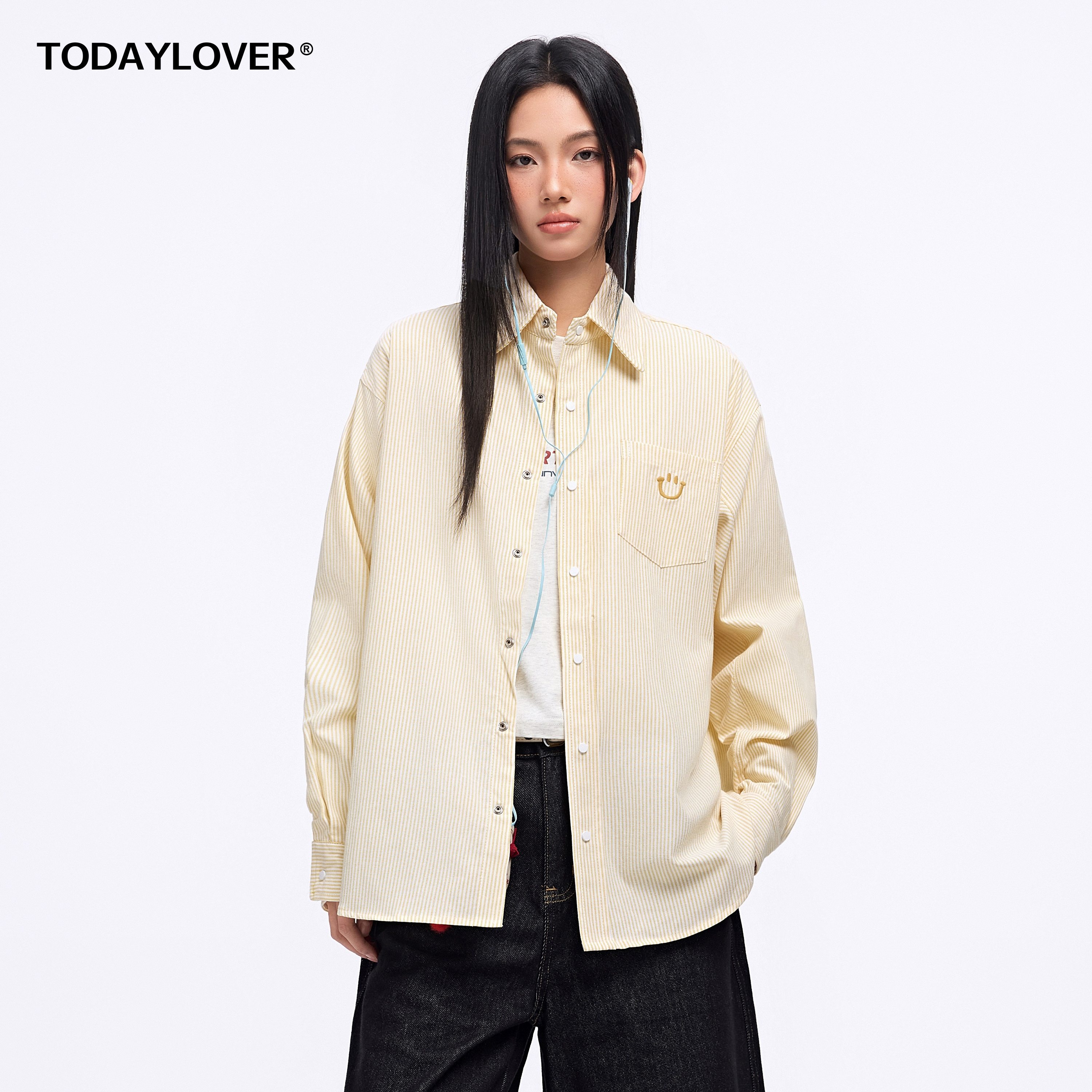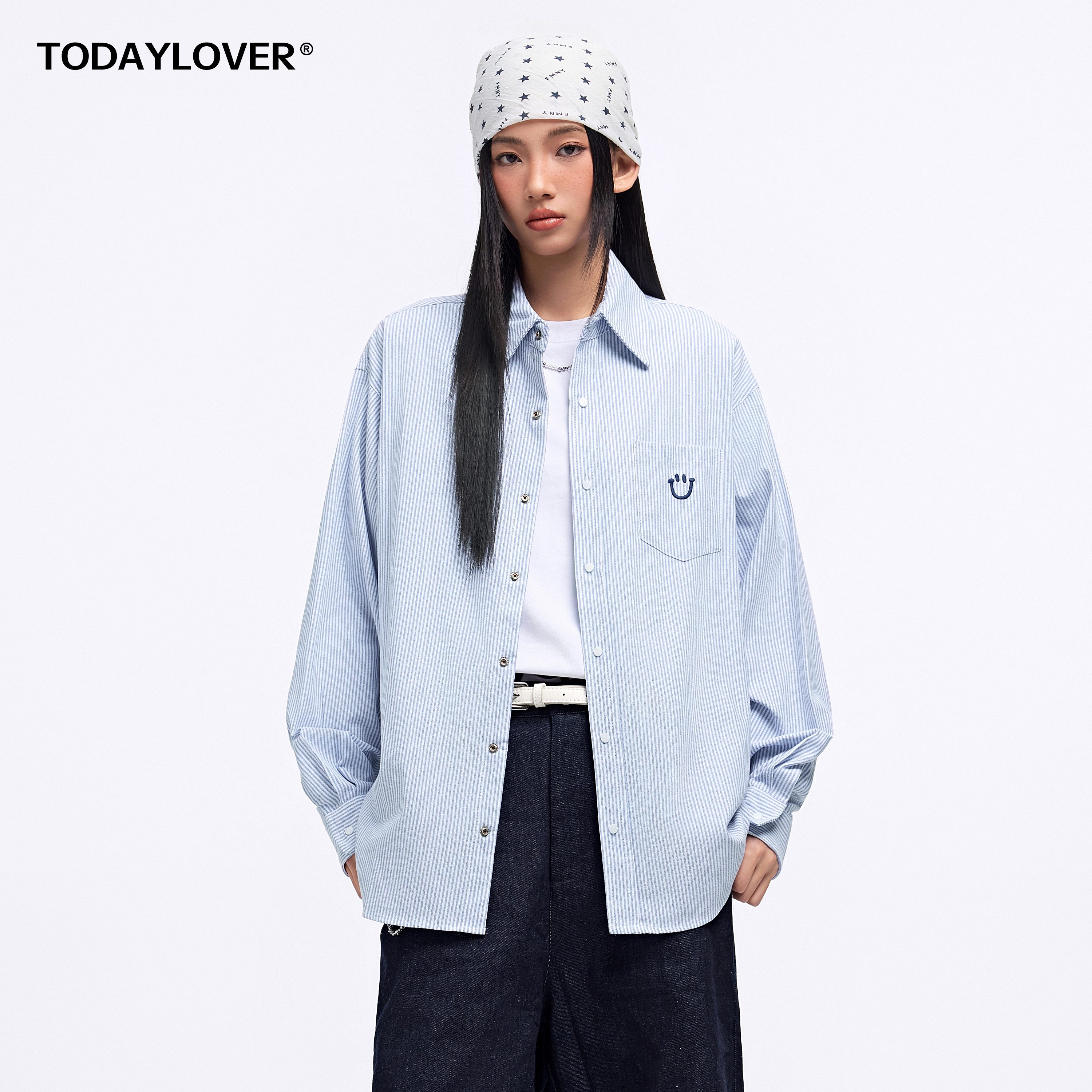 TODAYLOVER条纹长袖衬衫女春季潮牌新款笑脸宽松刺绣休闲衬衣外套