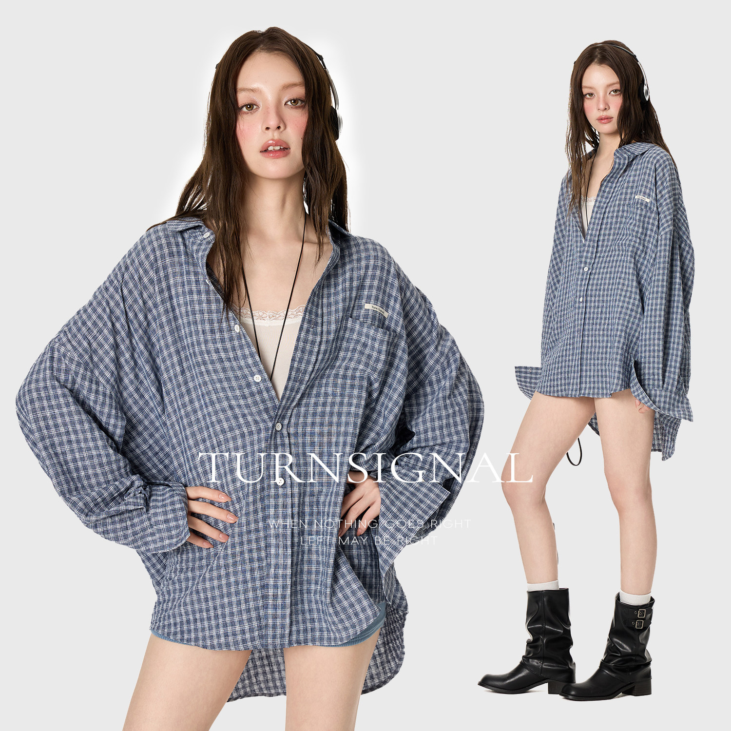 TurnSignal潮牌条纹格子衬衫女春秋防晒2026新款休闲宽松衬衣上衣