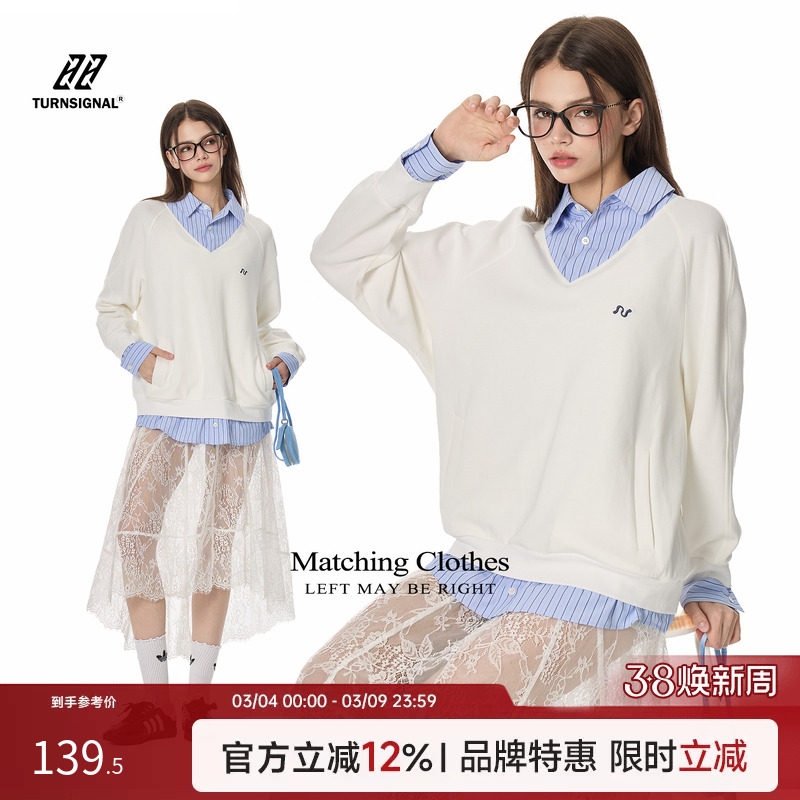 TurnSignal条纹假两件衬衫领卫衣女春季2026新款休闲宽松长袖上衣