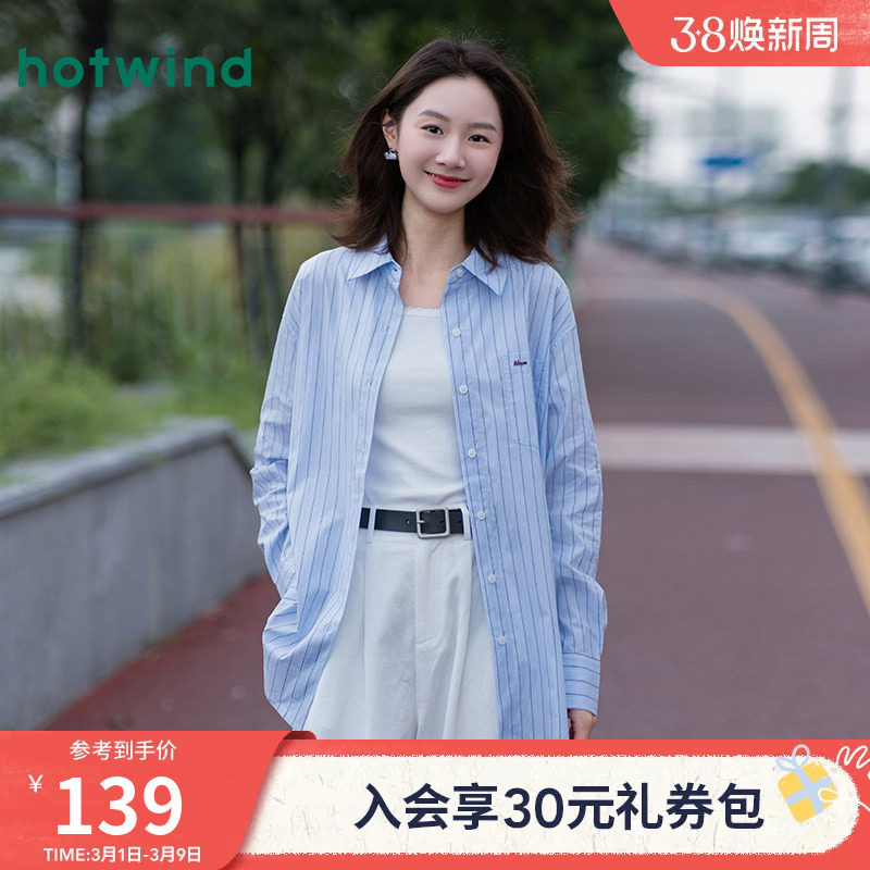热风女士休闲长袖衬衫2026年春季新款条纹宽松上衣内搭衬衣打底衫
