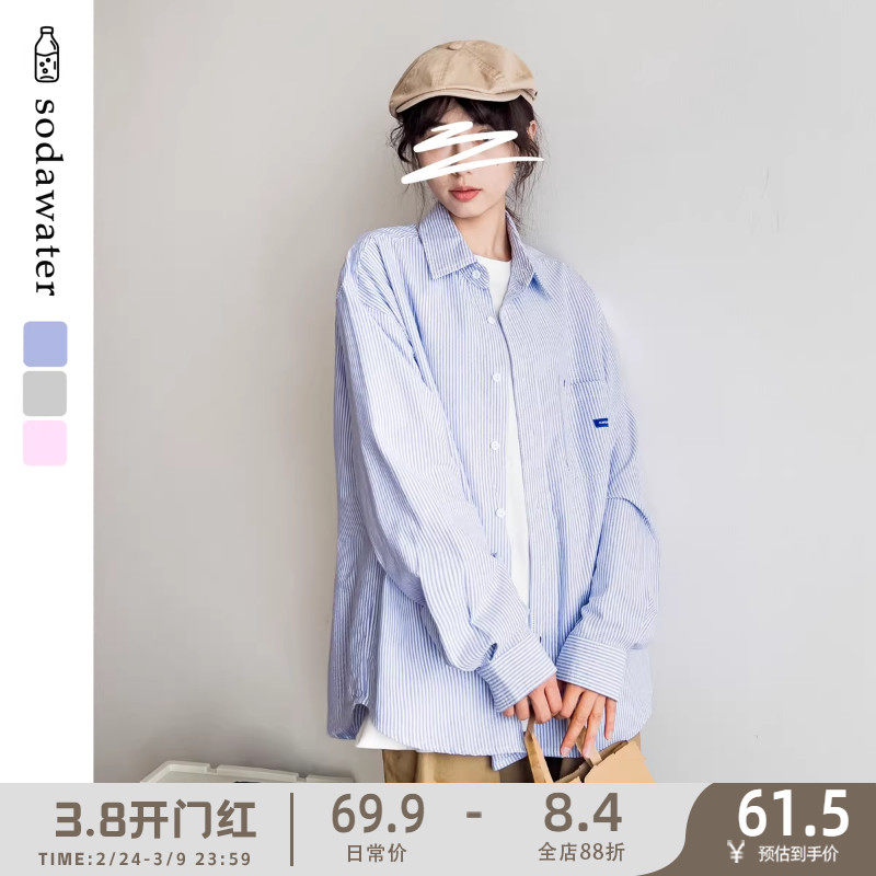苏打汽水工作室春季男女款蓝色条纹衬衫日系青春时尚休闲长袖衬衣