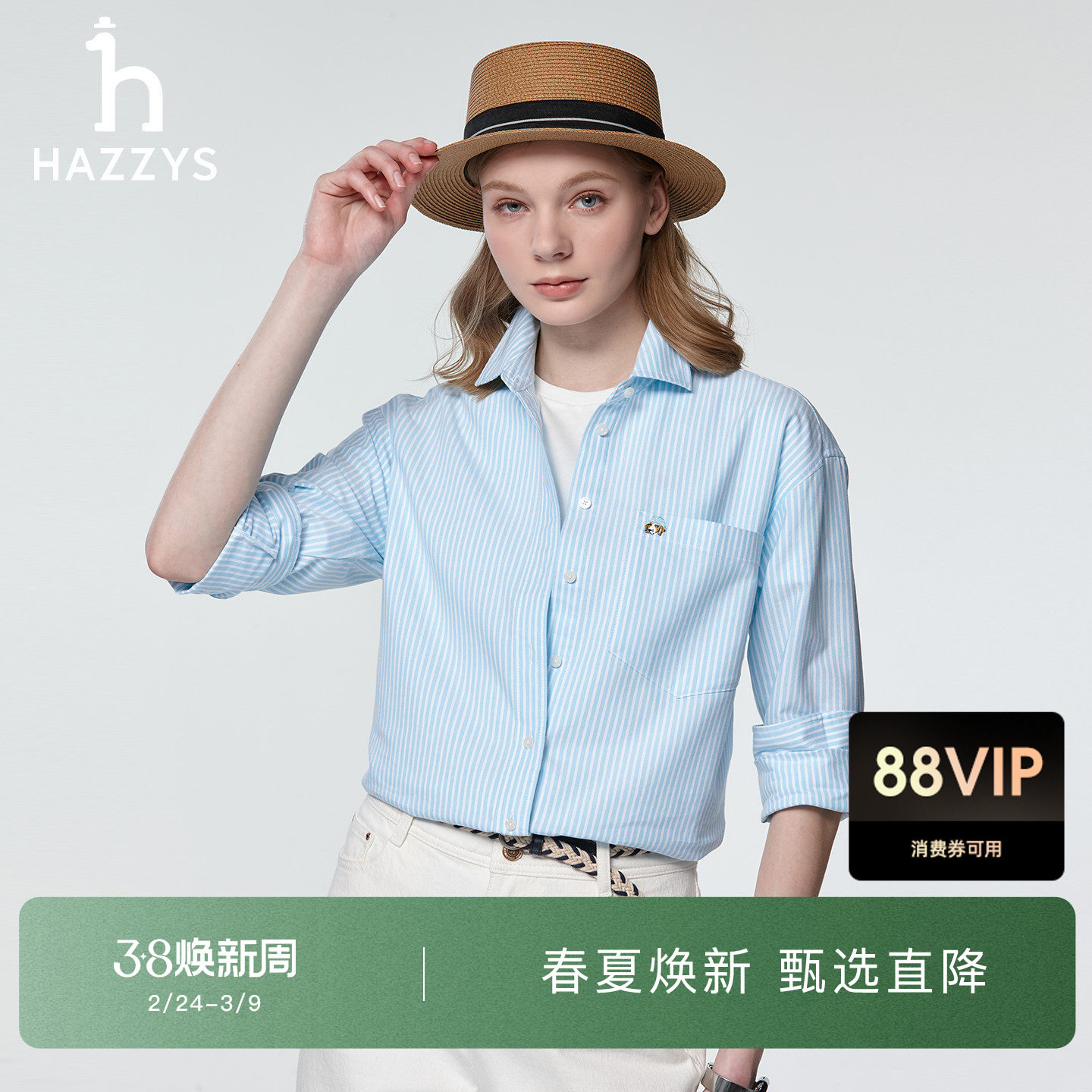 Hazzys哈吉斯长袖衬衫女春季条纹牛津纺衬衣时尚休闲宽松上衣外套