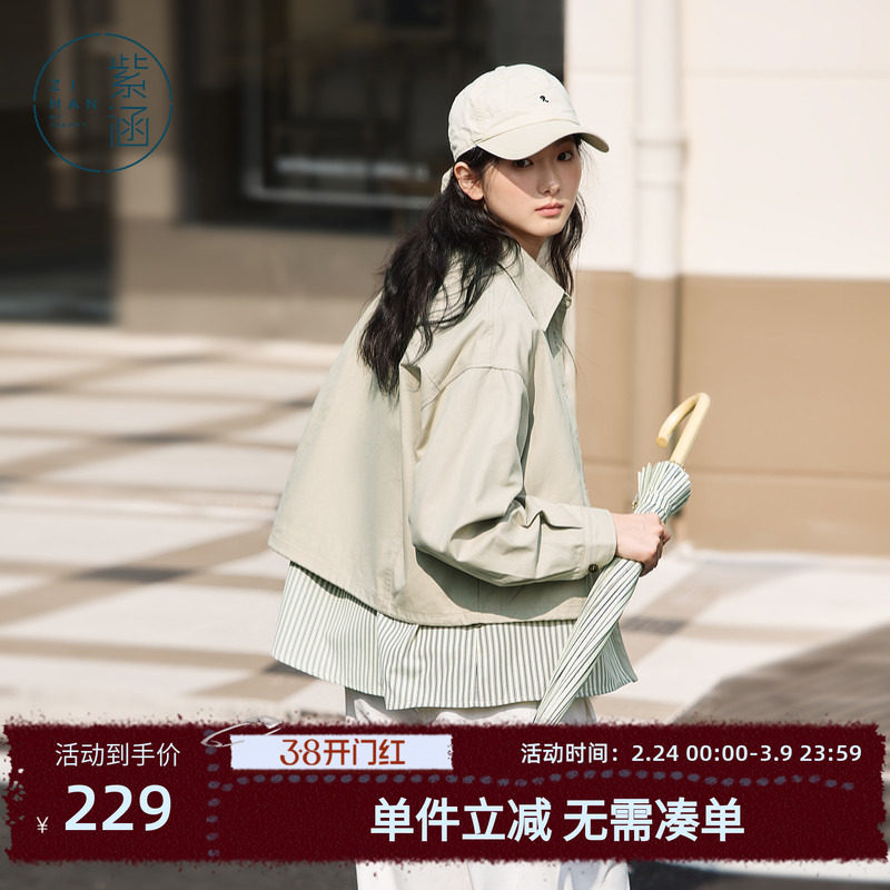 紫涵条纹拼接衬衫外套女春秋季新款宽松显瘦休闲户外通勤翻领上衣