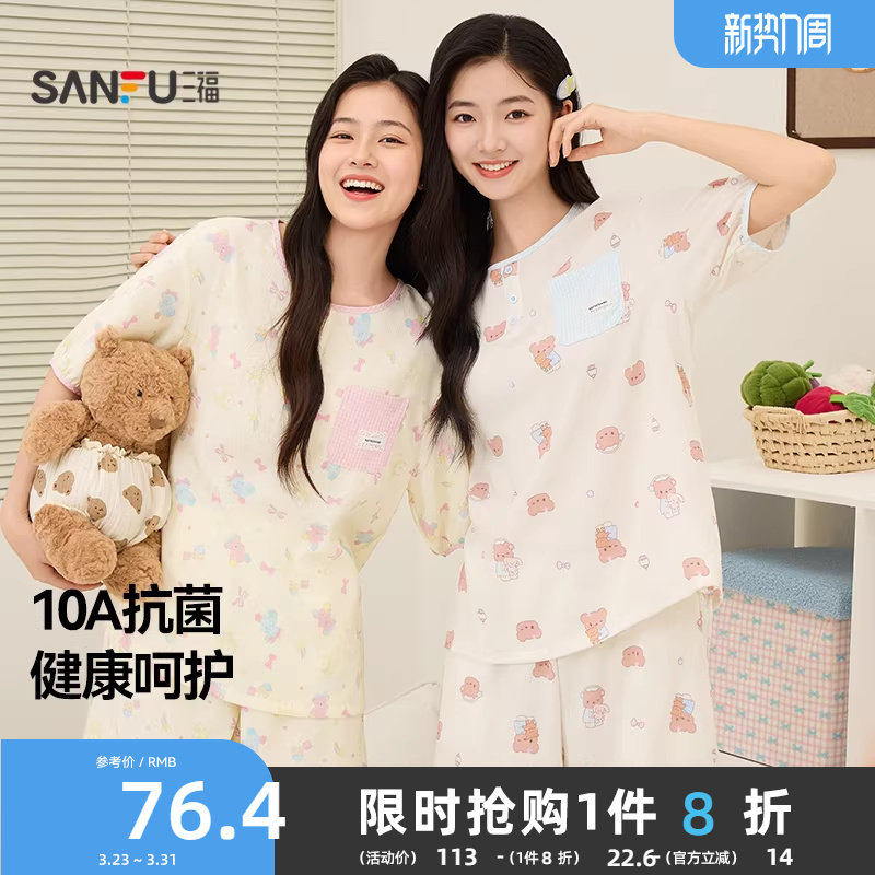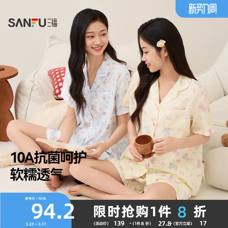 三福抗菌睡衣套装女款春夏季软绵绵翻领甜美图案小个子短袖家居服
