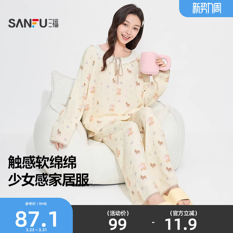 三福女春季花边圆领睡衣套装 甜美满印软绵绵宽松家居服515118
