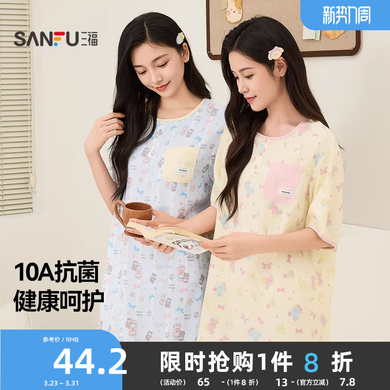 三福春夏季女款软绵绵印花抗菌睡裙甜系多巴胺宽松女生家居服睡衣