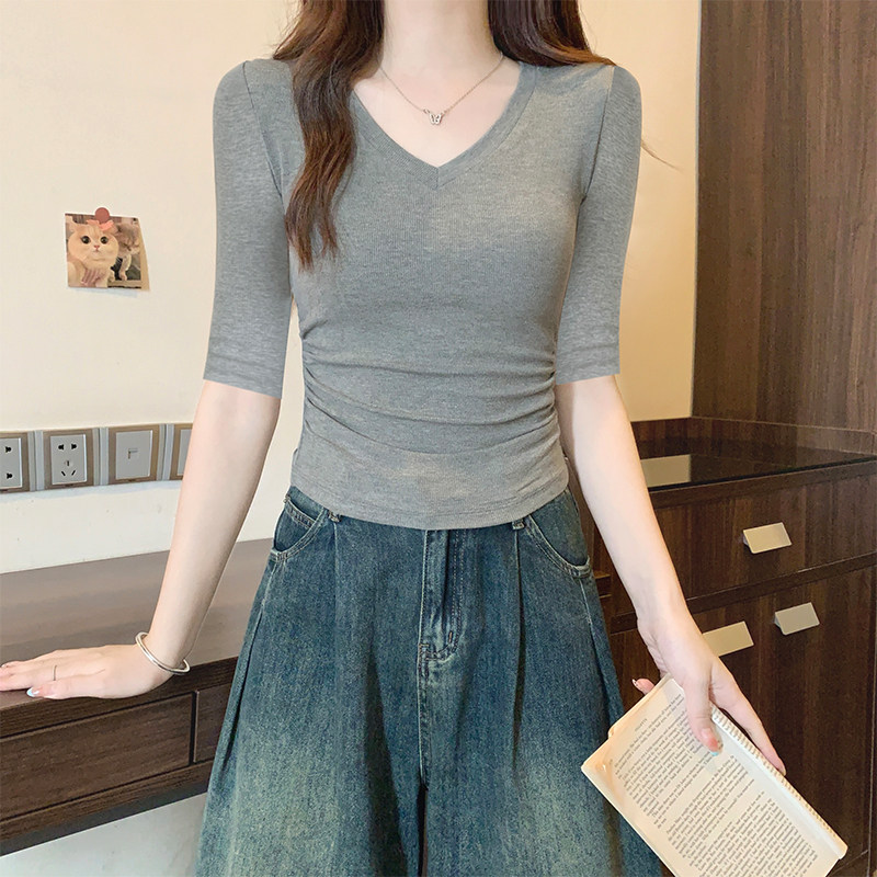 春装2024年新款v领中袖针织衫半袖t恤女修身紧身五分袖打底衫上衣