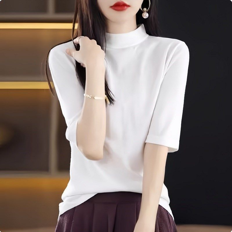 2025秋季新款亲肤半高领五分袖打底衫女紧身薄款针织中袖气质上衣