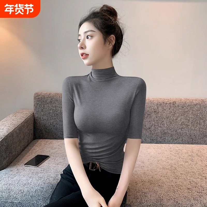 灰色半高领五分袖打底衫女春秋新款紧身内搭气质中袖针织T恤上衣