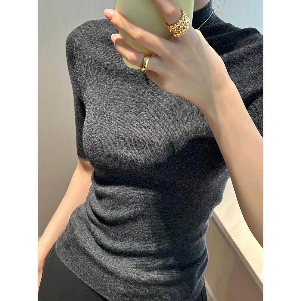 MintSiren中袖修身纯羊毛衫半高领半袖螺纹紧身针织衫薄款打底衫
