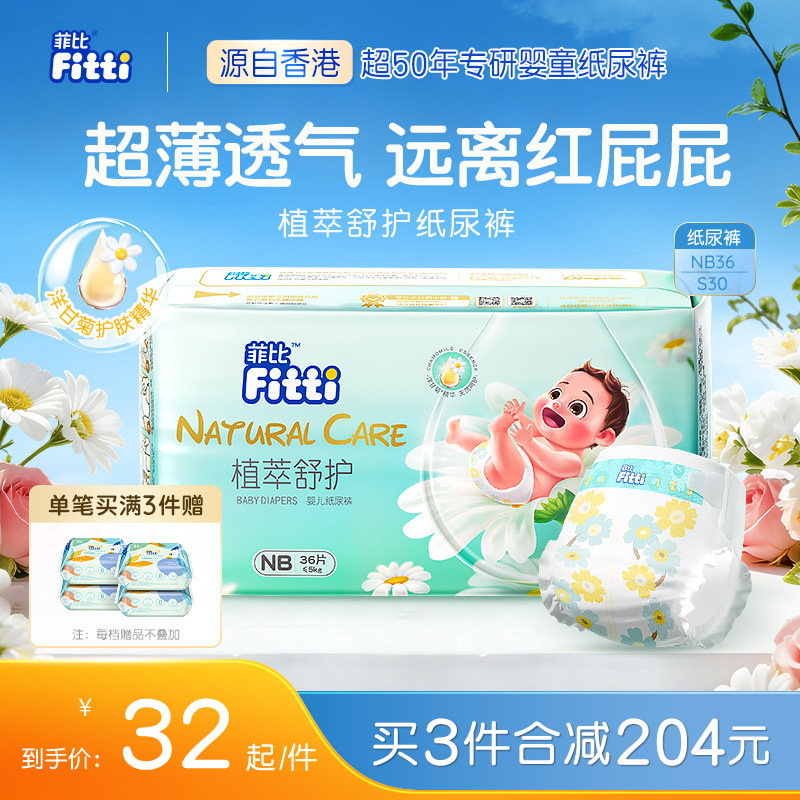 菲比植萃舒护新生儿纸尿裤NB/S码超薄柔软婴儿尿不湿敏感肌尿片