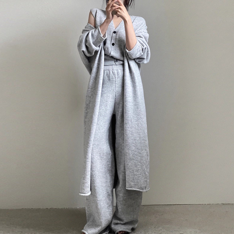 韩国chic秋季高级气质针织马甲背心+长款毛衣外套+休闲长裤三件套