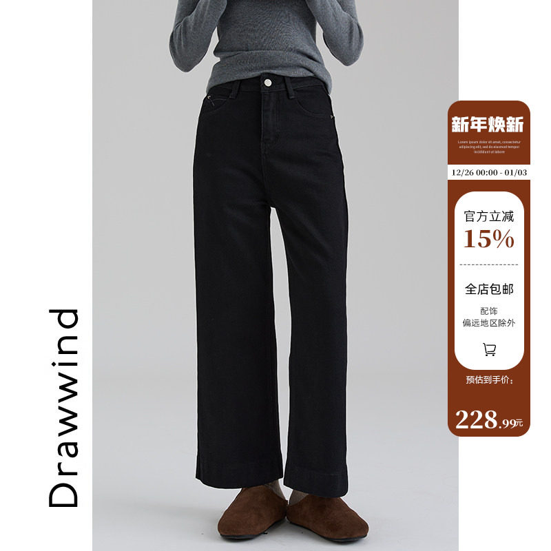 画风drawwind复合九分直筒裤女2025冬季新款通勤高腰显瘦牛仔裤子