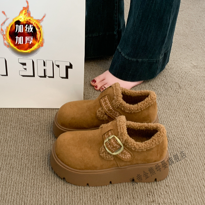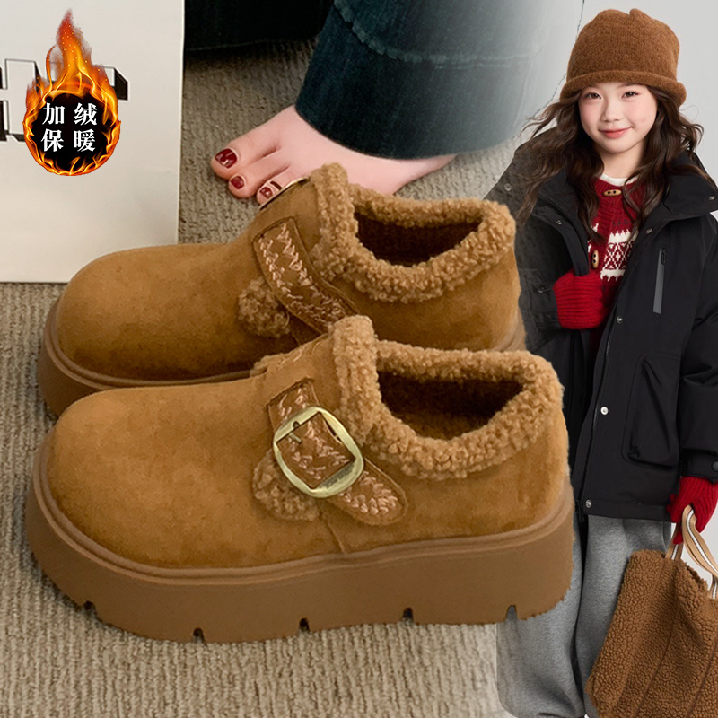 女童厚底勃肯鞋女鞋2026新款冬季雪地靴女款加绒乐福鞋毛毛二棉鞋