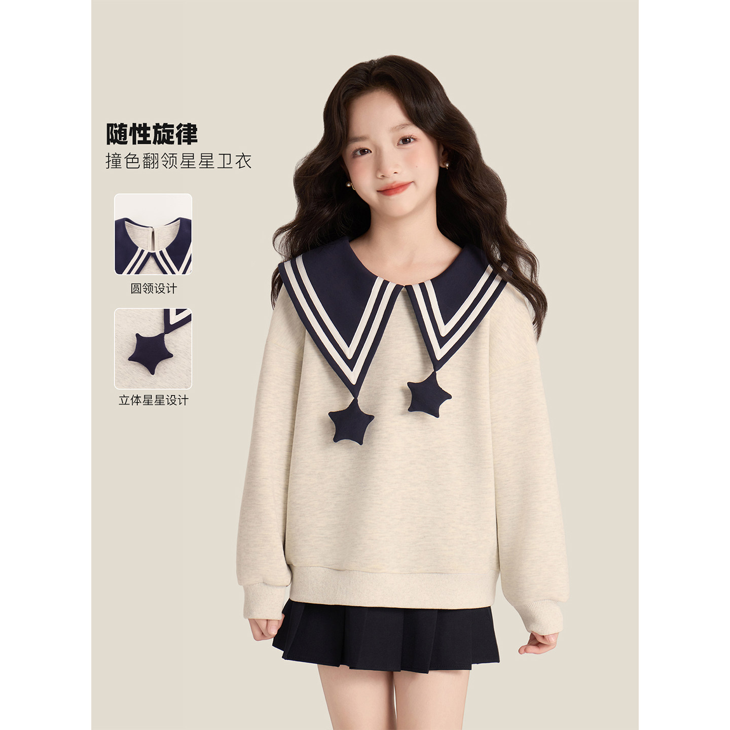 Amybaby女童上衣春季2026新款撞色翻领宽松落肩简约加绒星星卫衣