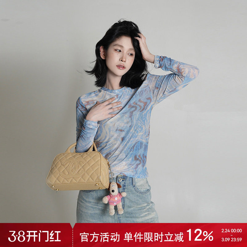 一穿爱上~美式复古不规则扎染网纱长袖t恤女早秋新款修身显瘦上衣
