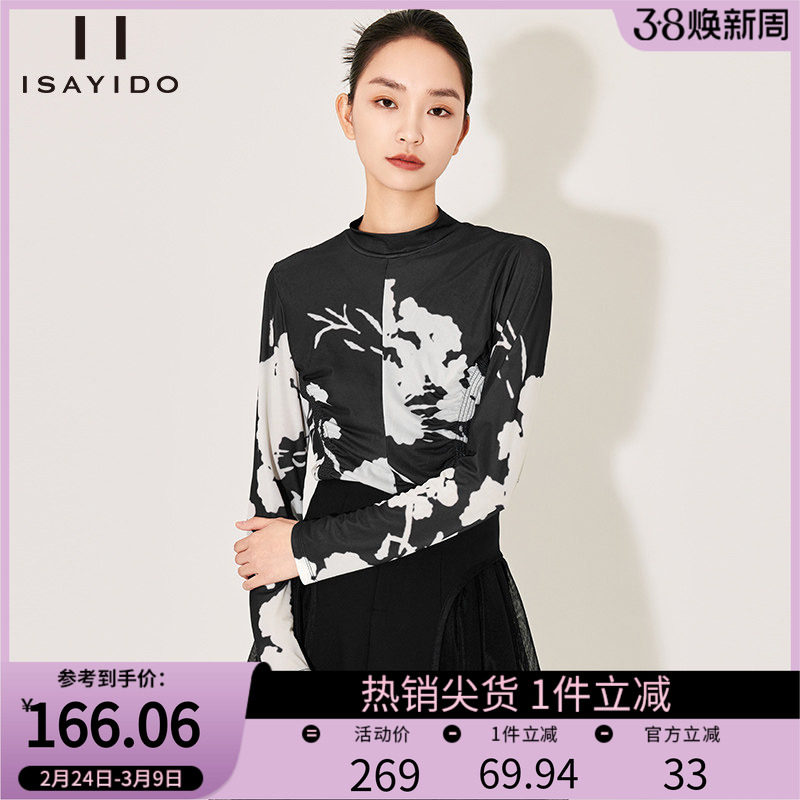 妖精的口袋满印抽褶收腰网纱长袖t恤女2026年早春新款内搭打底衫
