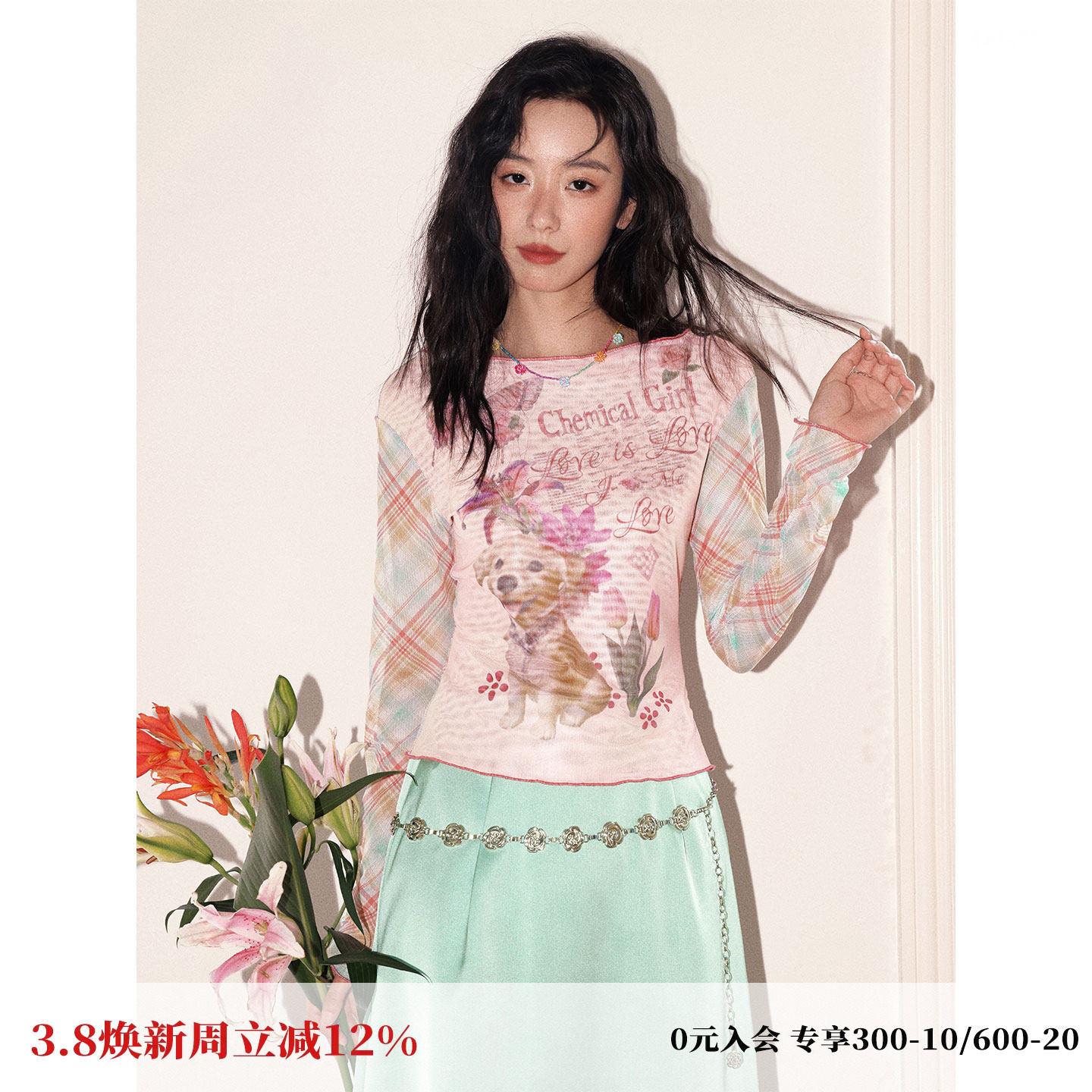 化学少女「小狗画报」一字肩卷边印花复古俏皮网纱长袖T恤女上衣