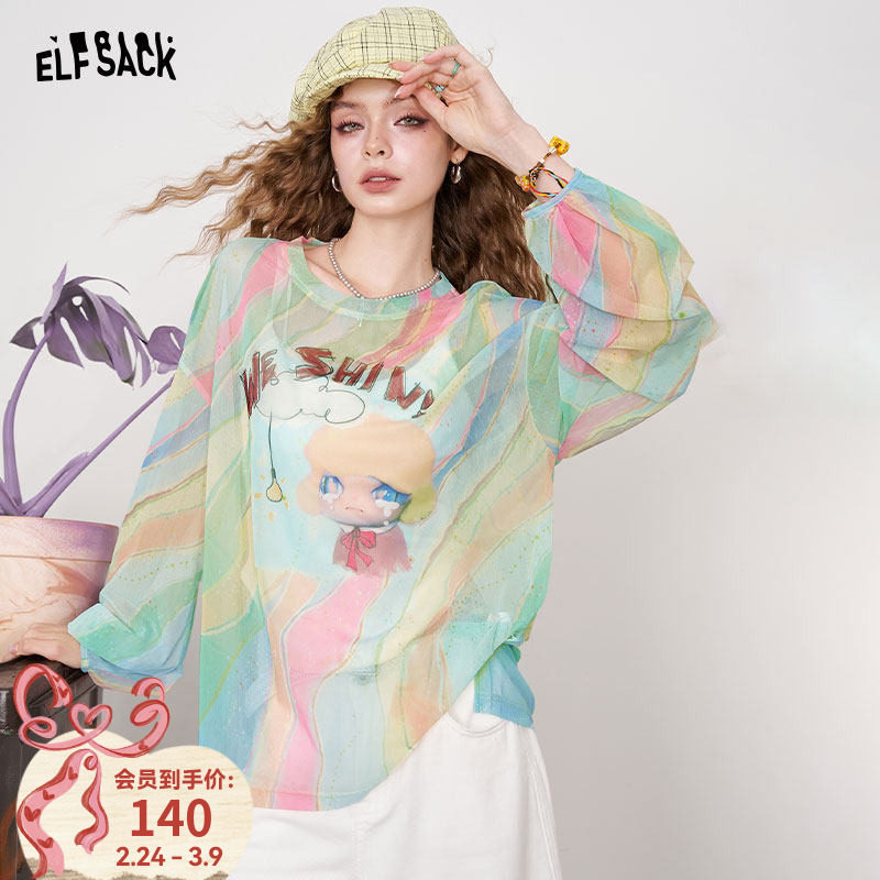 妖精的口袋多巴胺印花网纱长袖t恤女2025夏季新款慵懒风小众罩衫