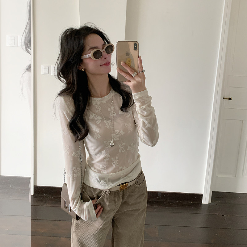 鱼没放 前后两穿 精致立体刺绣唯美蕾丝上衣 性感微透网纱长袖T恤
