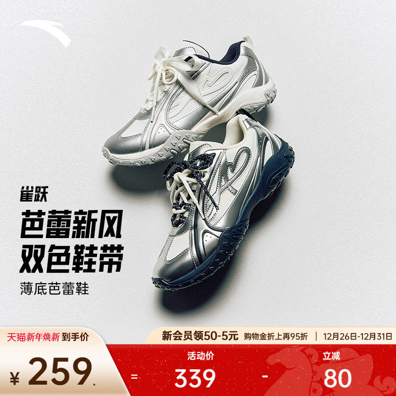 安踏雀跃丨芭蕾风银色休闲德训鞋女冬季薄底T头鞋潮流百搭运动鞋