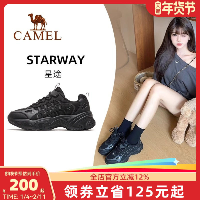 骆驼星途运动鞋女士2026春季防滑户外休闲鞋厚底增高老爹鞋子黑色