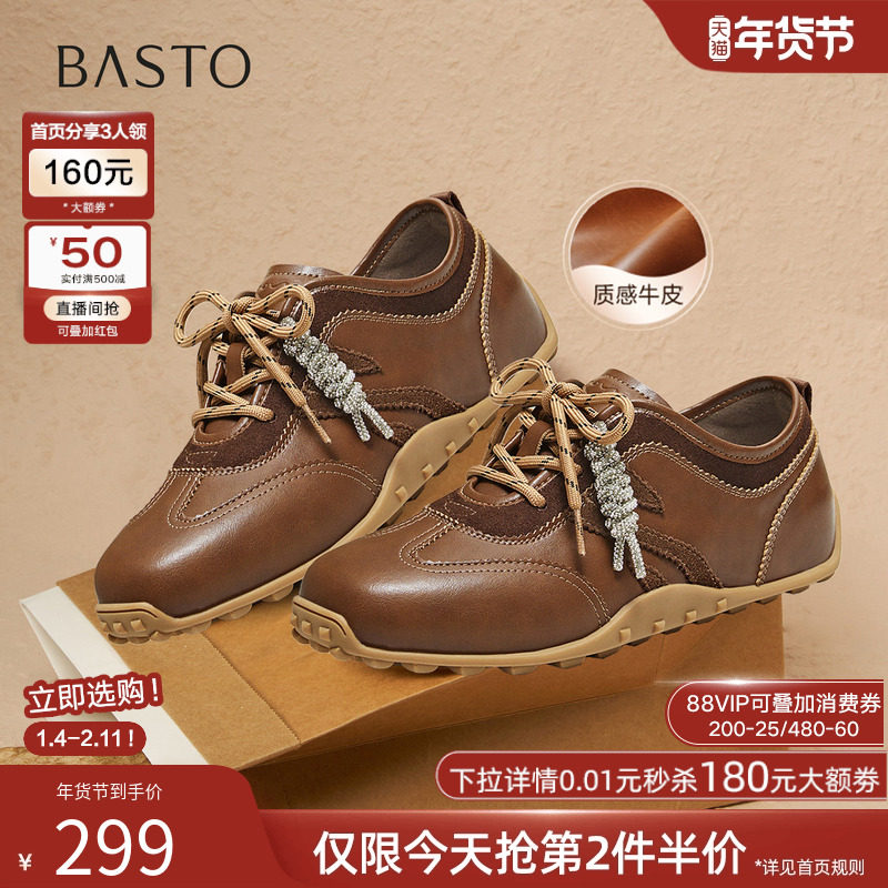 百思图2026春季新款真皮德训鞋棕色运动鞋女休闲鞋阿甘鞋D3590AM6