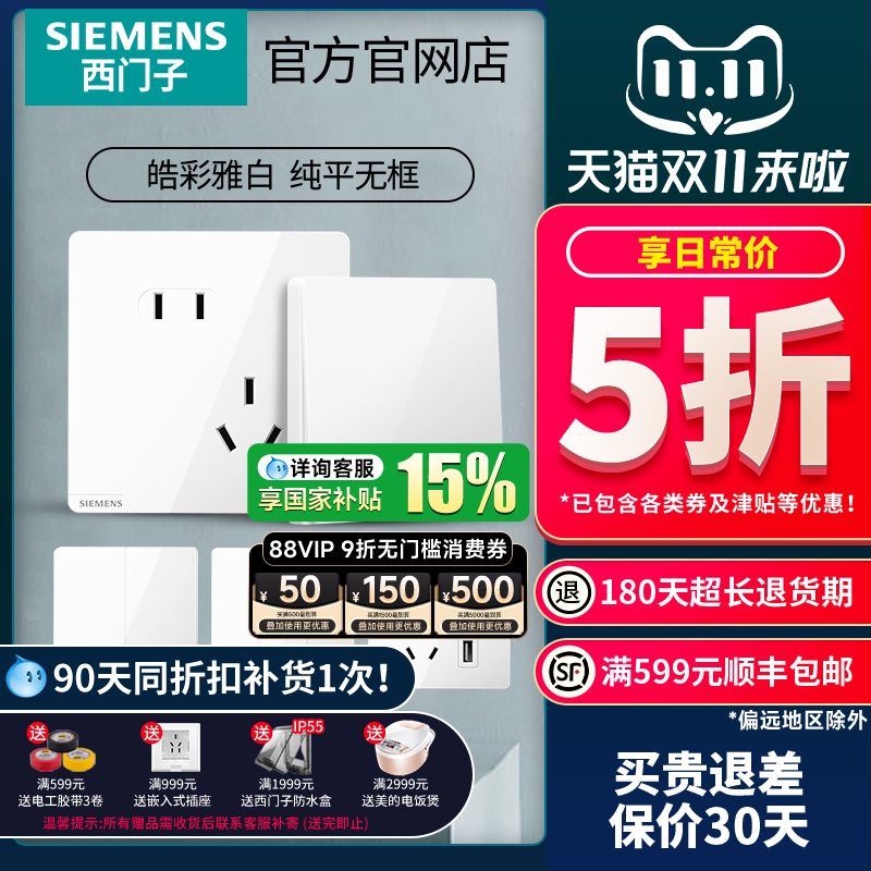 西门子开关插座面板 皓彩雅白家用86型五孔带双控开关(新国标)