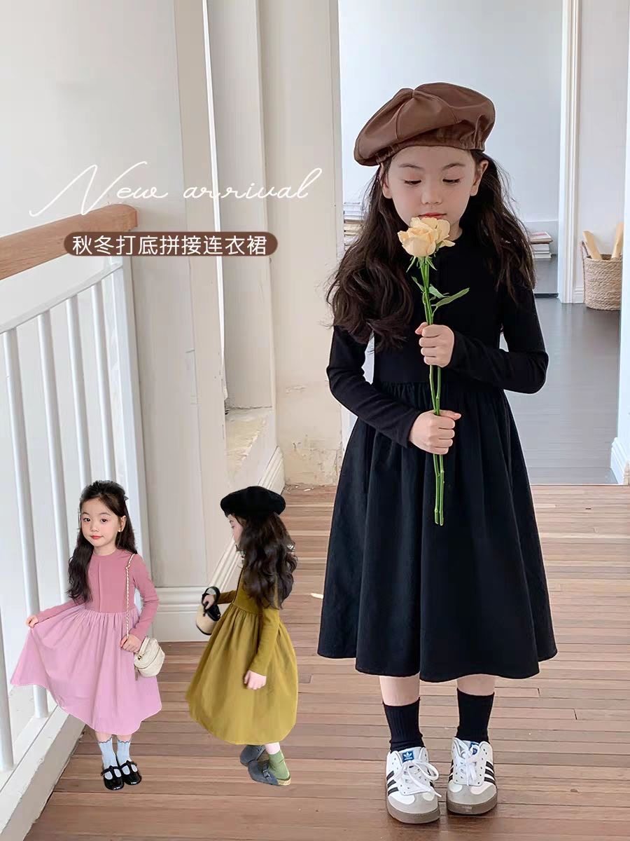 韩版ins新款女童翻领连衣裙中大童拼色公主裙长袖春秋款百搭时尚