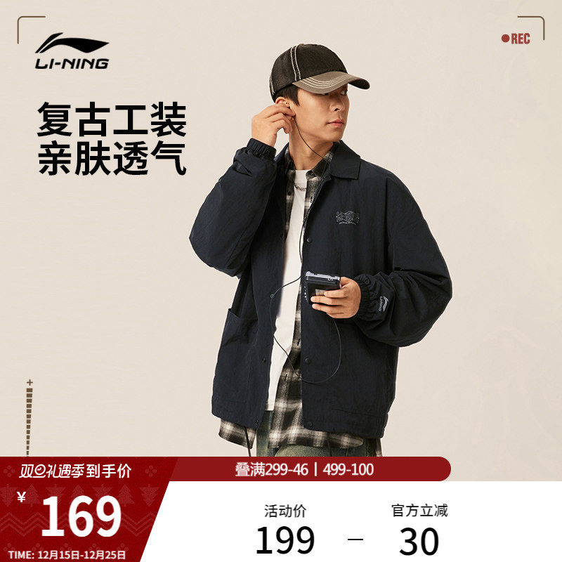 李宁外套男秋冬新款情侣复古学院宽松翻领运动上衣工装教练夹克女