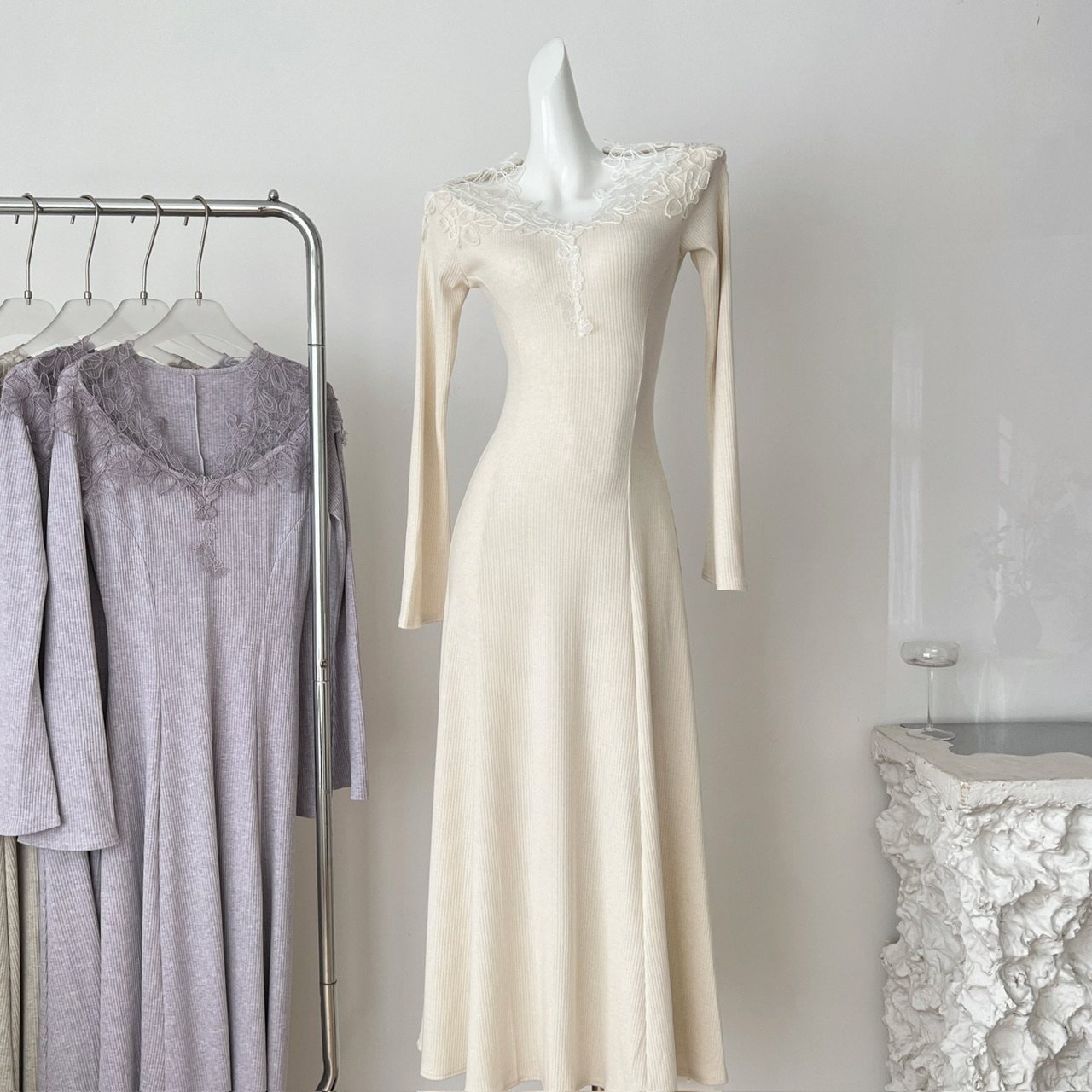 颂宋 秋冬温柔风蕾丝V领针织连衣裙优雅气质收腰显瘦长裙DT1703