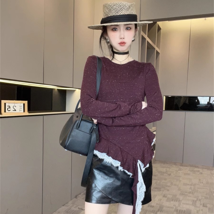 洋气欧货潮时髦上衣长袖T恤女2025新款荷叶边蕾丝斜边下摆小衫冬
