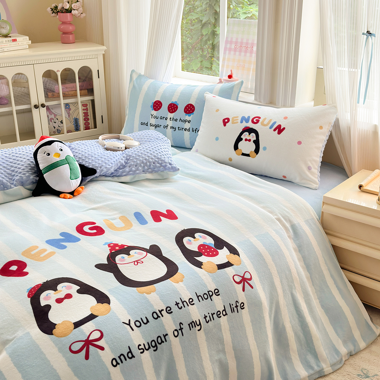 A类牛奶绒四件套大版卡通加绒加厚被套学生宿舍三件套保暖抗静电