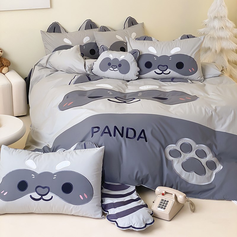 2025水洗棉毛巾绣床上四件套卡通熊猫非纯棉被套床单学生三件套件