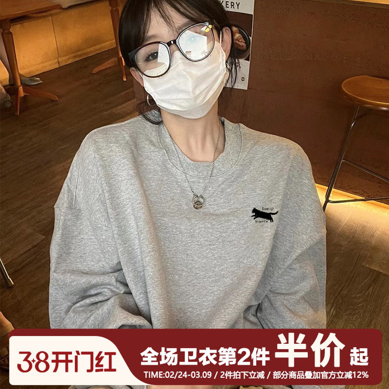ulzzang小众复古猫咪印花休闲大码女装宽松花灰色圆领卫衣加绒女