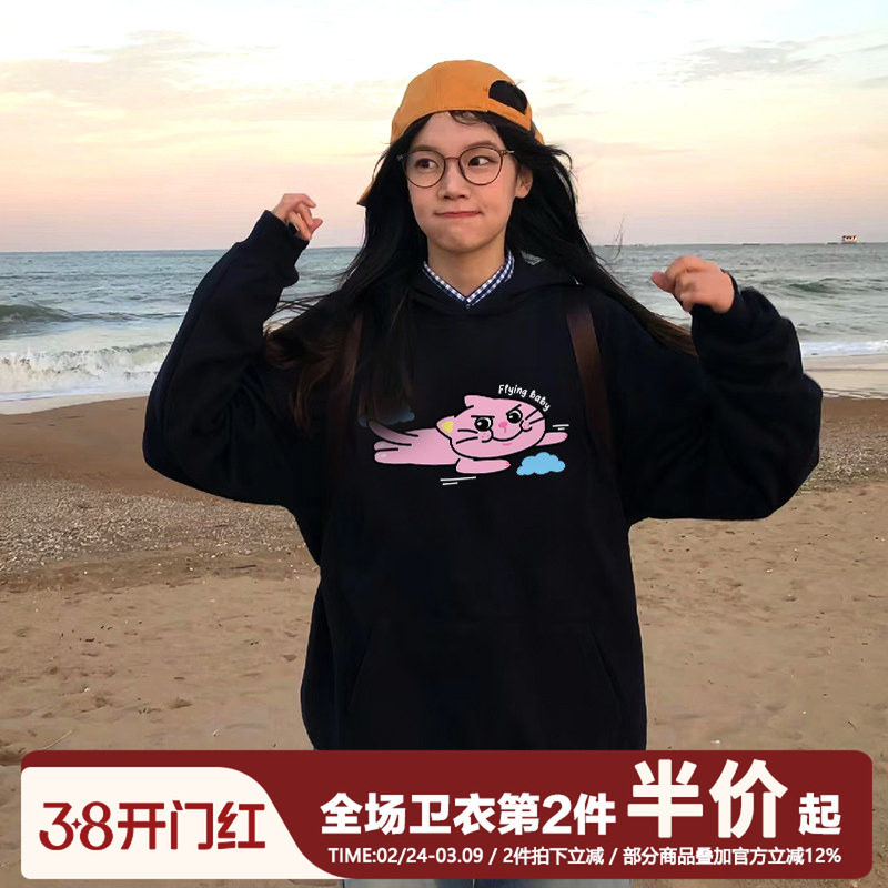 ulzzang小众设计感慵懒风猫咪印花连帽卫衣2026秋冬加绒加厚上衣