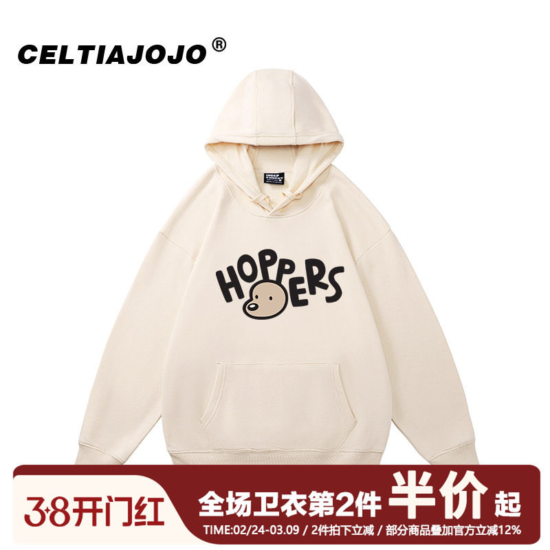 chic港风复古杏色加绒套头连帽卫衣ulzzang别致小众卡通印花上衣