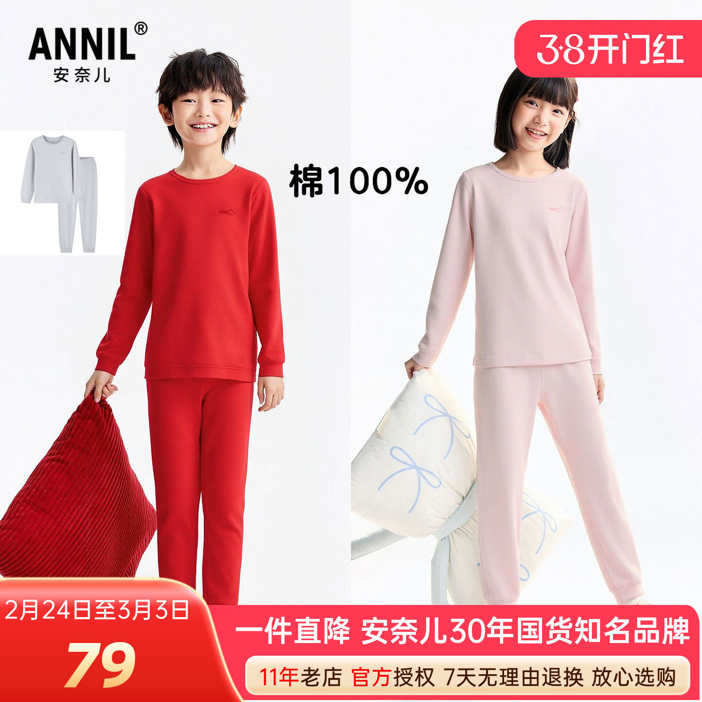 安奈儿男女童装纯棉打底秋衣裤套装2026春季新款红色睡衣裤家居服