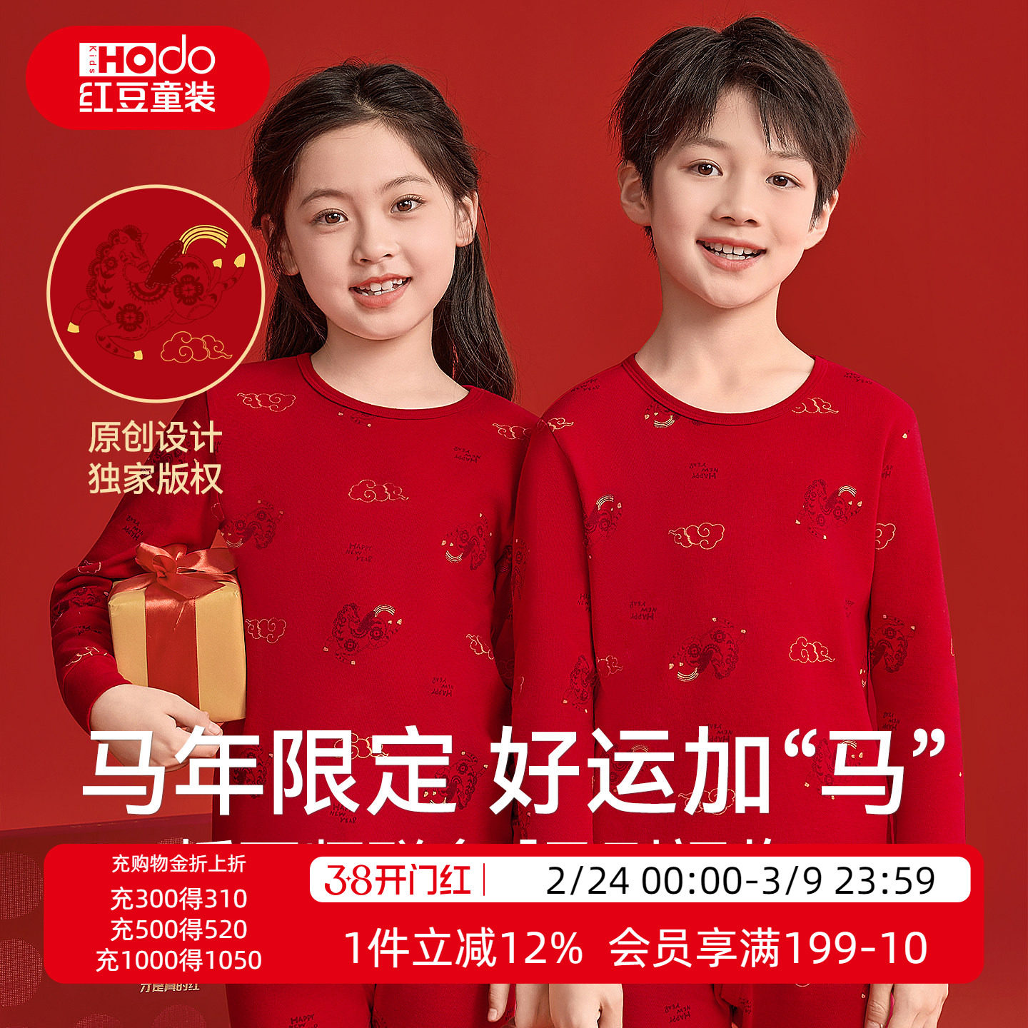 红豆儿童保暖内衣套装马年本命年红色打底衣德绒男童女童秋衣秋裤