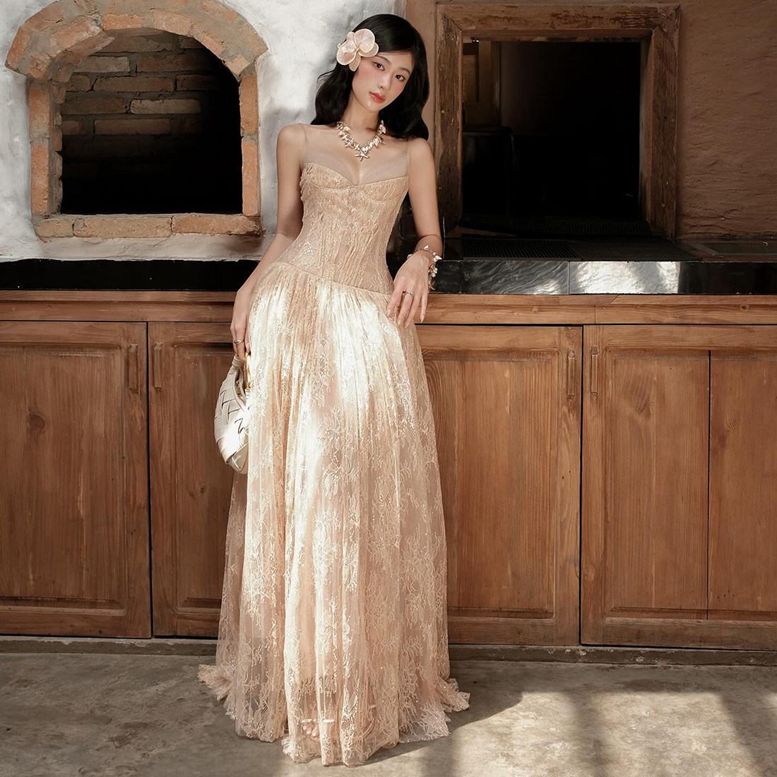 越南小众设计师气质收腰显瘦大摆长裙复古镂空蕾丝无袖背心连衣裙