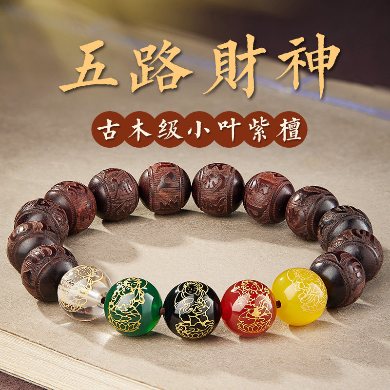 小叶紫檀手串男士五路财神文化转运珠文玩木质佛珠六字真言手链女