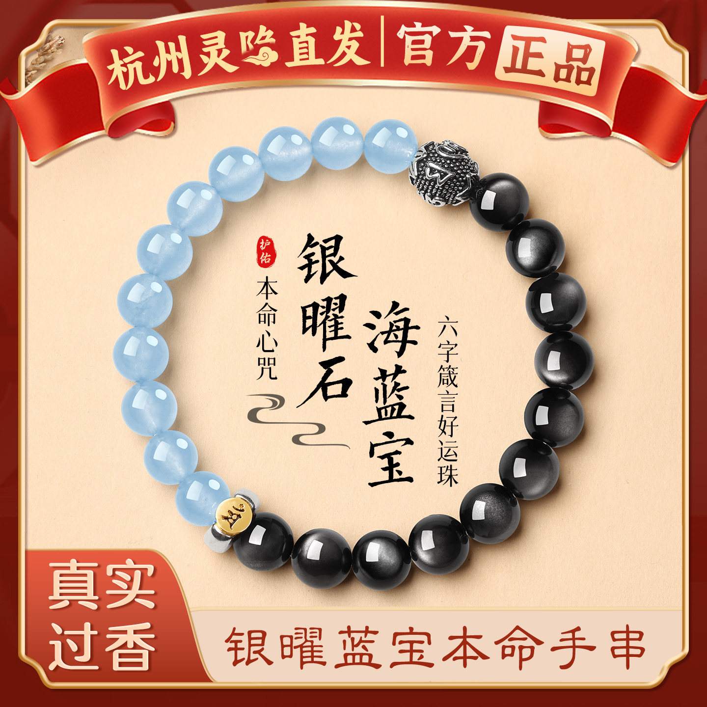 杭州灵隐黑曜石银曜石海蓝宝六字真言手串女款转运珠水晶手链补水