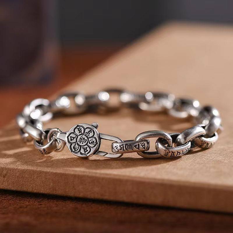 S925镀银六字真言金刚杵编织平安纹手链男 复古民族风回纹链潮