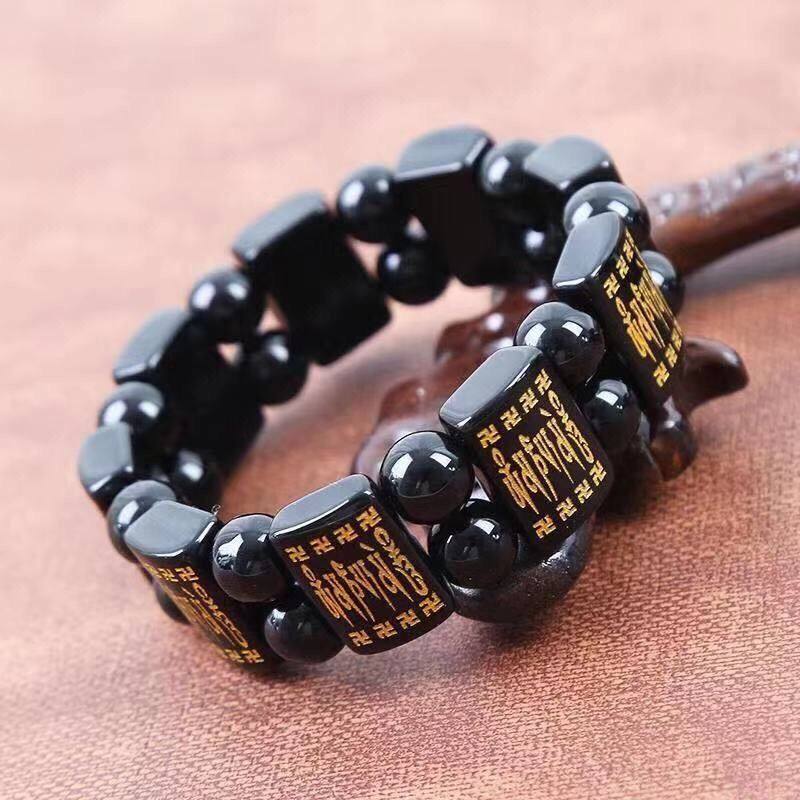 仿黑曜石六字真言手链双排手牌镀金图案男款方牌流行饰品直播爆款