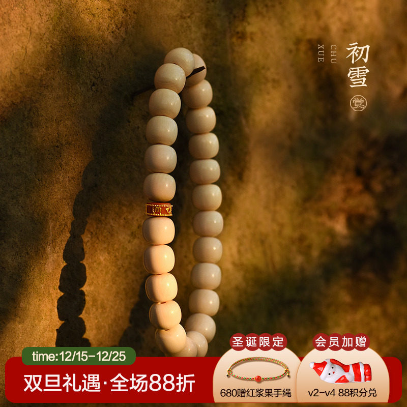 觉人原创天然冰料猛犸牙满纹手串18K黄金南红六字真言手链[初雪]G