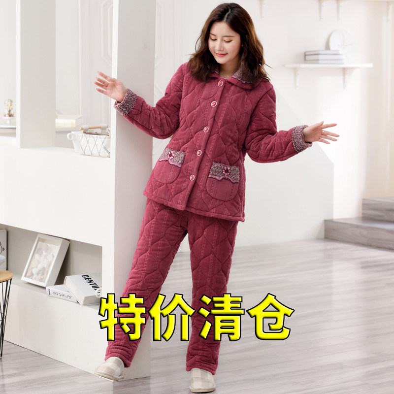 【特价清仓】睡衣女秋冬季加厚纯棉三层夹棉保暖可外穿家居服套装