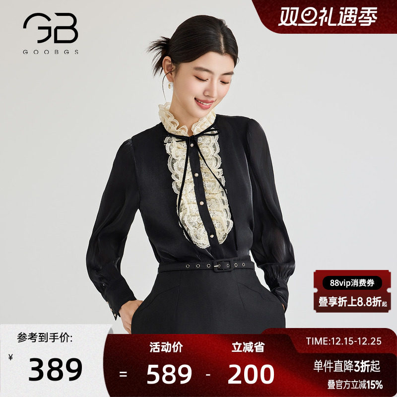 谷邦蕾丝拼接小衫女2025春秋新款立领法式优雅长袖宽松雪纺衫衬衫