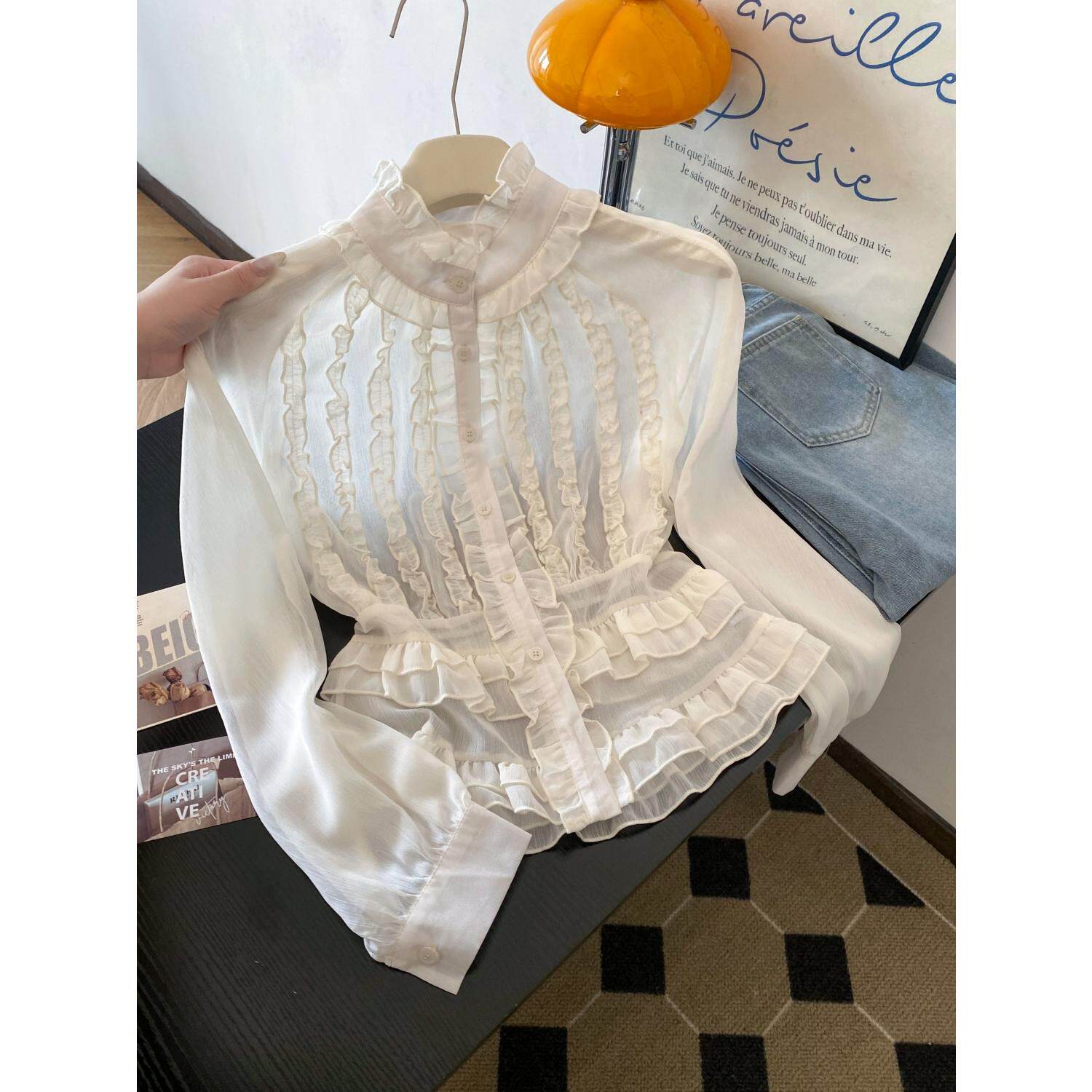 十三行法式宫廷风立领长袖衬衫木耳边修身雪纺衬衣温柔风收腰上衣